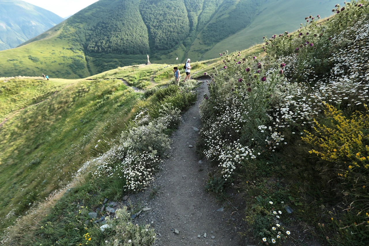 조지아사람들이 ‘쯔민다 사메바’로 부르는 게르게티 Gergeti Trinity Church교회에 오르는 길은 야생화로 가득하니 덩달아 행복하다. 해발 2,170m의 산 정상의 14세기에 지어진 담백한 교회 모습은 달리 뭐라 표현해야 할까, 그저 참하고 아름답다. 조지아사람들이 신성시한다는 이 교회는 전쟁이나 나라의 위기가 있을 때 교회의 중요한 보물들을 이 곳에 보관했다고 한다. 교회를 지나서 산악초원지대를 올라가면 2950m에 게르게티 빙하가 있다.