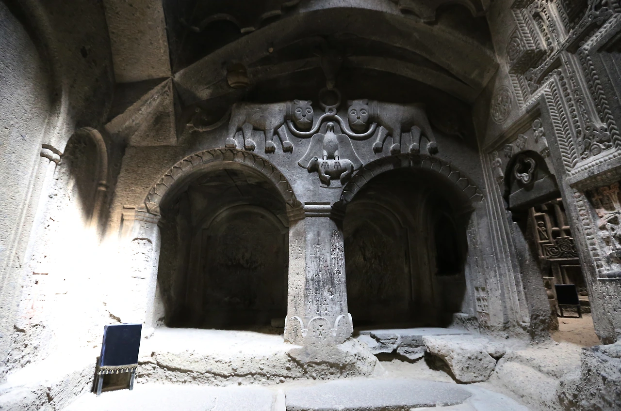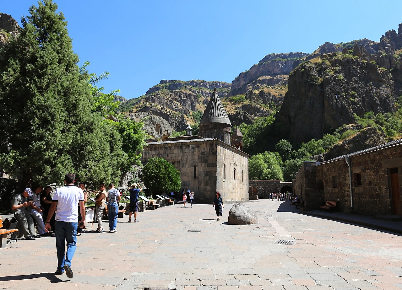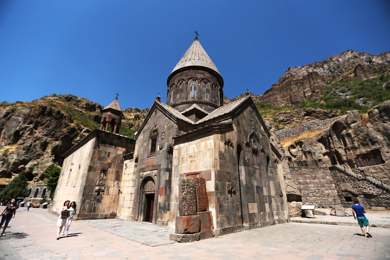 코르비랍 수도원에 갔던 날 들렀던 게가르트 수도원은 코타이크 Kotayk 지방 아짜트계곡의 깎아지른 절벽에 둘러싸여 있는 동굴 사원이다. Geghardavank라고도 부르는 게가르트는 창이라는 뜻으로 ‘롱기누스의 창’을 말하며 ‘롱기누스’란 십자가에 달린 예수님의 옆구리를 지른 로마 병사의 이름이다. 다른 종류의 많은 성물들과 함께 이곳에 있었던 롱기누스의 창은 지금은 에치미아진에 보관되어 있다.
