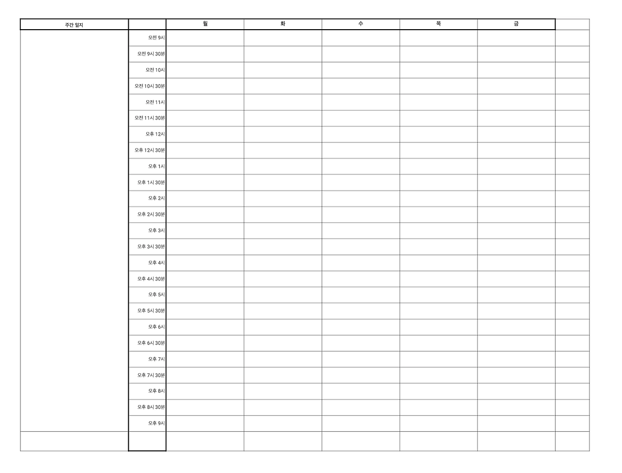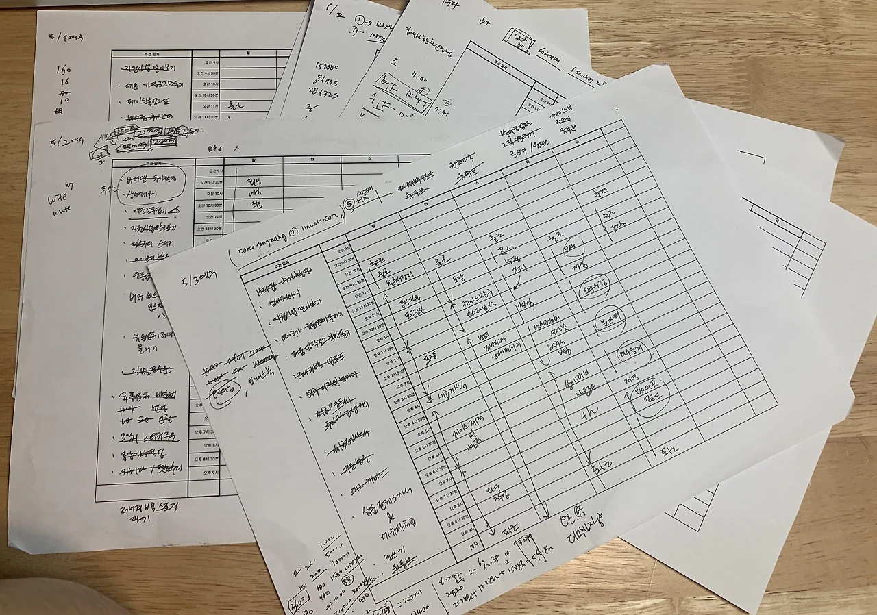 시간표의 사용법은 이러하다. 매주 월요일이 되면 출근하여 왼쪽 주간 일지 칸에 이번 주에 꼭 해야 하는 일들을 적는다. 그런 다음 미션을 완료하면 하나씩 지워나간다. 이 작은 행위가 나름의 성취감을 준다. 그리고 매일 출근을 하면 출근 한 시간에 "출근"을 적어두고 그때그때 일을 하고 끝나면 계속 계속 적어나간다. 마지막으로 퇴근을 적을 때면 내가 오늘 한일들이 한눈에 보이면서 불안이라는 함정에 안 빠지게 된다.