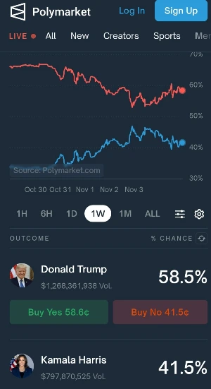 나 개인적으로 그랬다. 그러나.. 대선 전부터 비트코인이며 트럼프와 해리스의 당선을 걸고 갬블? 베팅하는 사이트는 이미 선거가 시작되기 전부터 트럼프를 보여주고 있었다.