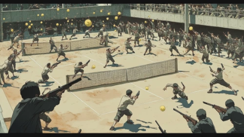 “총을 쏘자. 지난번에 총 쏘는 게임 만들었다며? 공을 안 치는 사람은 심심하니까 총을 쏘는 거야. 상대가 공을 못 받게끔. 원래 개굴소대도 총 쏘는 장면이 많이 나오던데? 맞지? 자네가 애니메이션 안 본다고 하도 화를 내서 내가 몇 편 봤거든. 하하하하.”