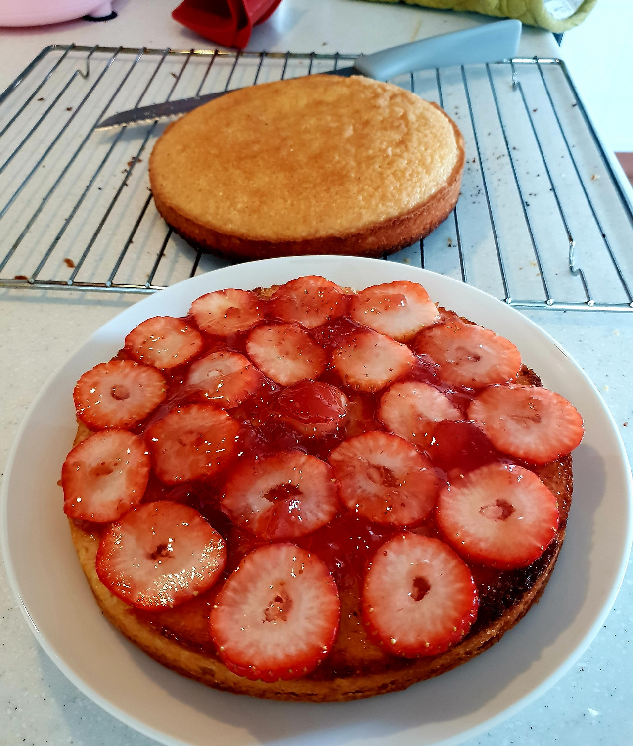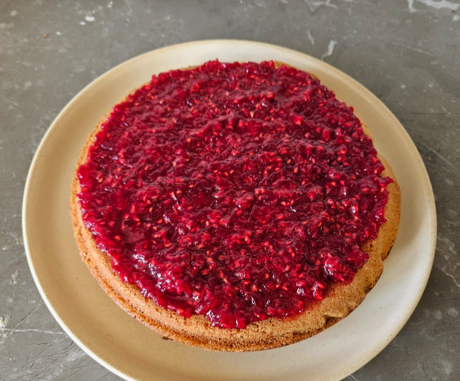When the cake is fully baked, spread strawberry jam or raspberry jam. I also added some sliced strawberries to the jam - It is the season for berries now. After spreading everything on the bottom cake (first cake), put the top cake (second cake) on top, like a sandwich and prepare some tea.
