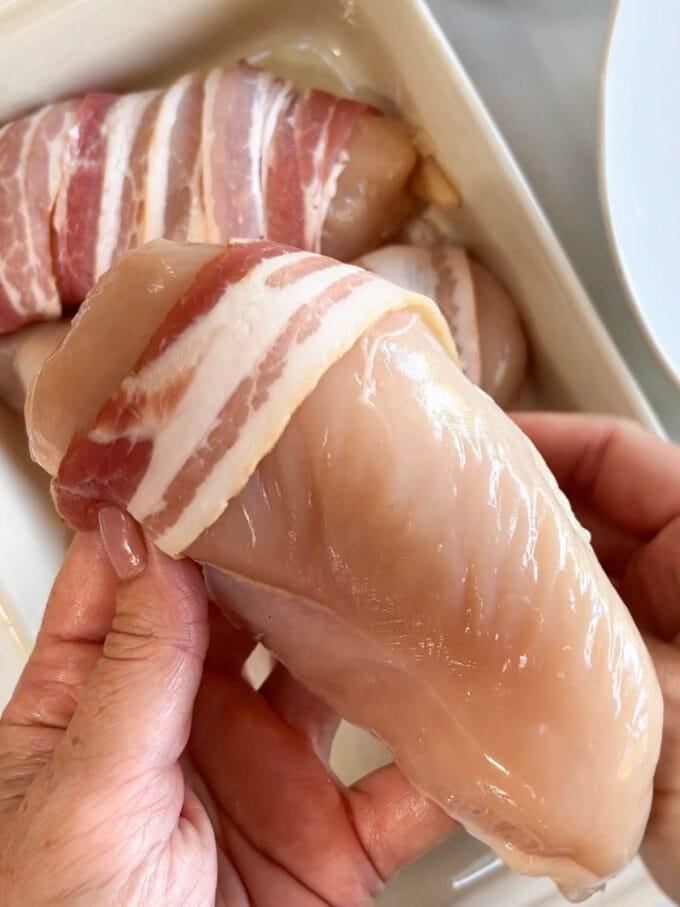 4 Oil a baking dish for the chicken. Wrap two slices of bacon around each piece of chicken and place them in the oiled dish.