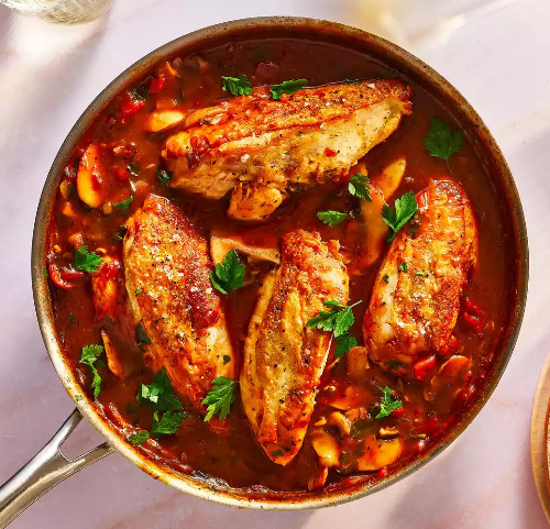 The British version of hunter’s chicken is very simple but the versions from other countries are quite different. 'Hunter', the British dish name, 'cacciatore,' the Italian dish name, and 'chasseur', the French dish name, all have the same meaning. This dish originated somewhere in the middle of Italy around the Renaissance period. Italian noblemen who indulged in hunting as a form of entertainment hunted pheasant and foraged wild mushrooms and herbs in the forest. When they returned they handed them all to their cook and therefore the cook called the dish ‘hunter’s chicken’. Tomatoes were added because their acidity softens the meat, and olives and onions were added for a rich flavour. The form of the stew is the same but ingredients such as herbs and olives vary depending on the region, and the recipes also vary. Although cooking styles are similar in each country, their recipes are slightly different, but cooking with bacon seems to be only in the UK.