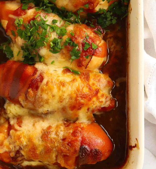 This dish goes well with coffee or wine because of the combination of the acidity and sweetness from the barbecue sauce with the juicy meat. This dish is particularly delicious with dry red wines such as Chianti, Rioja, Shiraz, Pinot Noir or Malbec. People say white meat goes well with white wine and red meat goes well with red wine, but in this case I think the strong taste of the sauce and the bacon wouldn’t go so well with white wine.