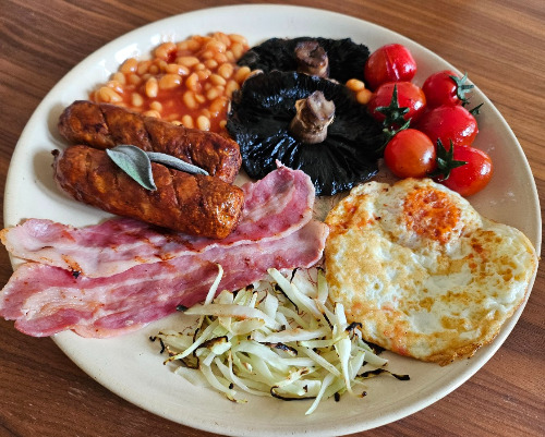 I think a proper full English breakfast, also called a fry-up, is about cooking with ingredients selected according to your own personal taste. Feel free to swap in or out what you like best, you don’t need to stick to just the traditional fry-up ingredients. I cook it with different vegetables, such as aubergine, courgette, onion, cabbage, or different varieties of mushrooms and tomatoes depending on what is in my fridge.