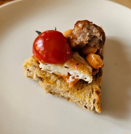 I generally prefer vegetables but I have to eat meat because the weekend chef enjoys it. If you have sage in your garden you can add it when you fry the sausage in the pan. Sage removes the meaty odour and adds a herbal scent to the sausage, so it improves its flavour. Many sausages in the UK are made with sage for this reason. I often include black pudding in the breakfast but on this occasion there were already a lot of meaty ingredients so I skipped it.