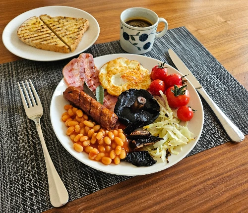 5 Arrange the well-cooked sausage, bacon, mushrooms, tomatoes, egg and baked beans together on a large plate, and serve with the toast on a side plate and your cup of coffee.