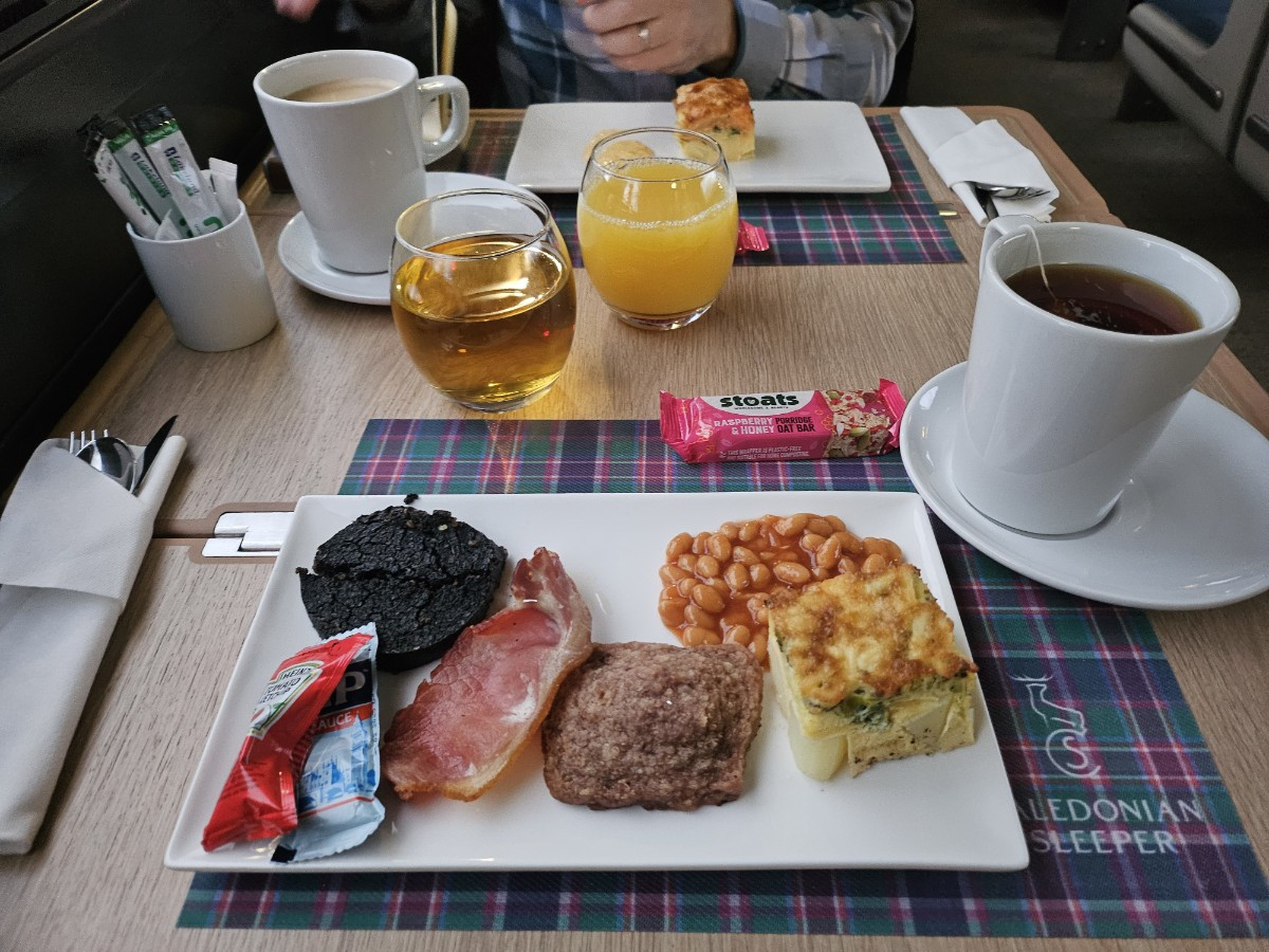 한잔하고 돌아와 대충 씻었더니 금세 잠이 들었고 눈 떠보니 벌써 아침이었다. 푸르스름한 새벽에 창문 밖으로 지나가는 풍경이 어찌나 좋은지 기차여행 기분이 제대로 났다. 아침 6시가 좀 넘었을까? 기차는 이미 글라스고에 도착해서 정차 중이었다. 후다닥 짐을 싸고 아침 식사는 비건정식과 일반정식을 하나씩 주문했다.