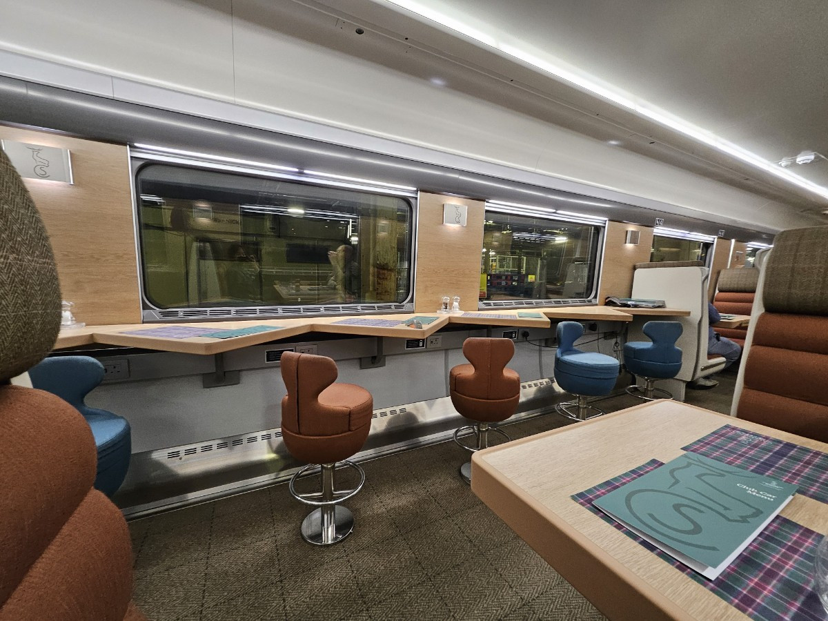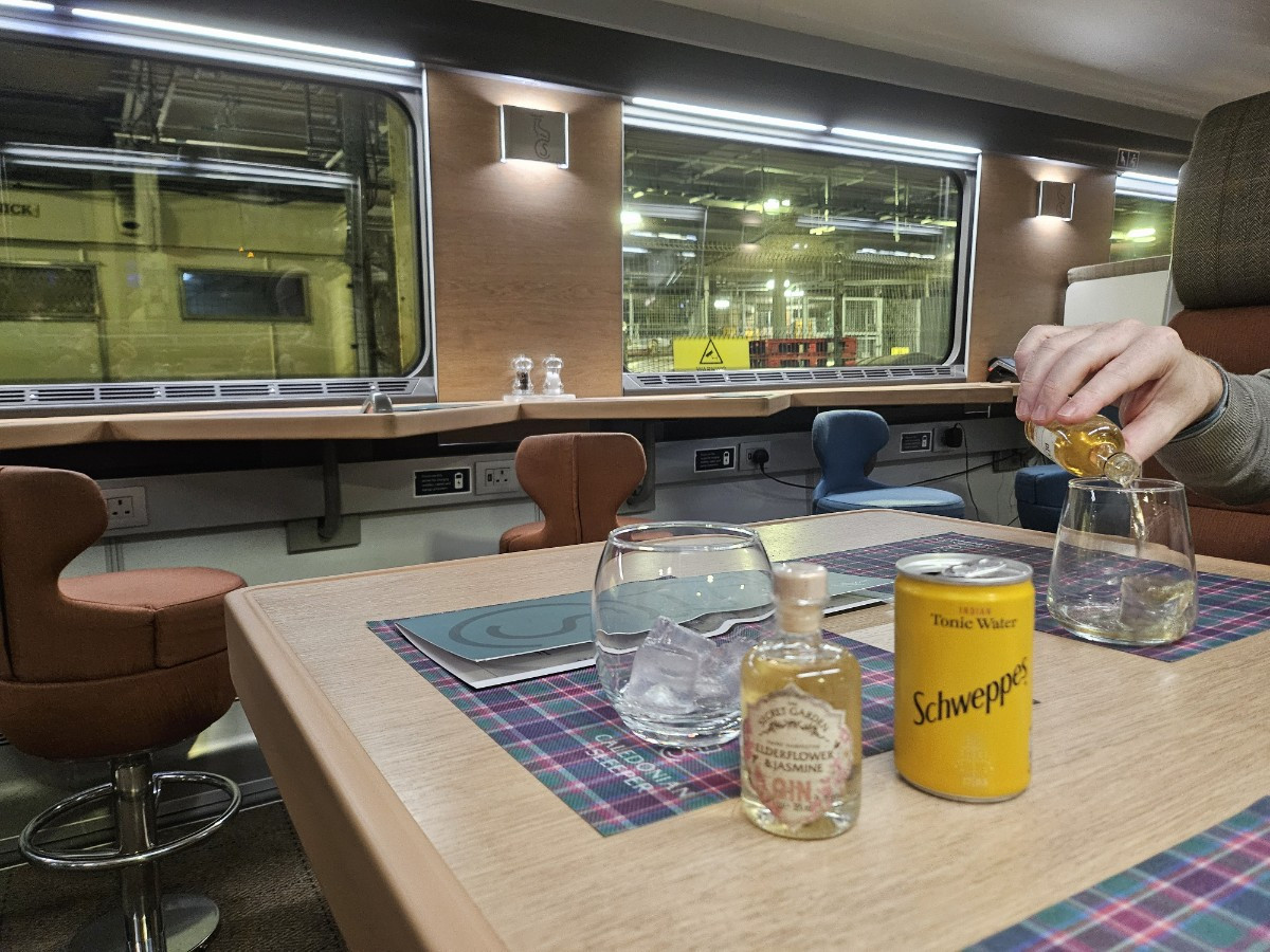 기차에 올라타 방에 짐만 풀고 club car로 이동해 위스키와 진을 한잔씩 했다. 클럽카는 스코틀랜드 가는 열차답게 카펫도, 좌석 시트도 트위드였다. 타탄 패턴의 아이템들이 꽤 눈에 보였고 여러 종류의 위스키와 진, 와인이 준비되어 있었다.