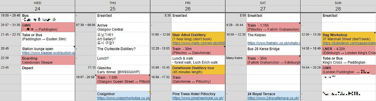 짧고 굵은 여행을 위한 폭풍 검색으로 각자 하고 싶은 것, 가고 싶은 곳을 먼저 리스트업 했다. 합의를 통해 리스트는 하나로 추려졌고 시간표가 정해 졌다. 시간이 없으니 동거인과의 원활한 일정 공유를 위해 나는 sheet를 만들었고 동거인은 기차표와 호텔 등의 예약을 하며 진행상황을 표시했다.