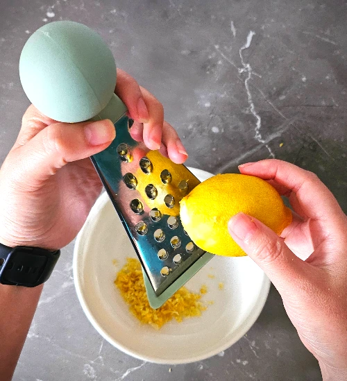 내가 사용하는 치즈 그레이터는 피라미드 형태의 세 가지 크기로 그레이팅 할 수 있는 타입이다. 나는 제스트의 씹히는 맛을 좋아해서 큰 구멍을 사용하여 그레이팅 했다. 제스트는 왁스 코팅이 안되어있는 레몬을 사용하는 게 좋다. 만약 왁스가 발라져 있는 레몬이라면 왁스코팅을 먼저 제거하고 사용해야 한다. 과일을 체에 넣고, 막 끓인 뜨거운 물을 골고루 부어 주거나 뜨거운 수돗물을 틀어놓고 과일을 헹군 후 뻣뻣한 야채 손질용 브러시로 과일 전체를 문질러서 닦는다. 다시 차가운 물로 깨끗이 헹구고 물기를 제거한 후 제스트를 만들면 된다.