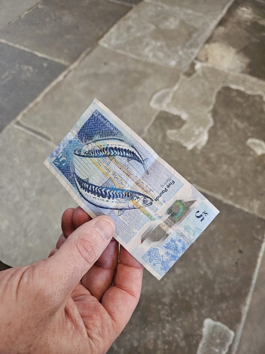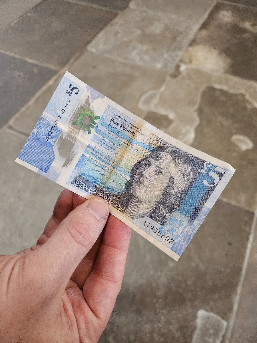 커피 수혈을 마치고 본격적인 글라스고 구경을 위해 가까운 지하철역 사물함을 찾아 짐을 맡겼다. 카드리더가 고장 나서 현금을 냈더니 거스름돈으로 스코틀랜드에서 유통되는 파운드 스털링 지폐를 받았다. 앞면에는 초대 은행 총재였던 일레이 경(Lord Ilay)의 초상화가, 뒷면에는 고등어가 그려져 있다.