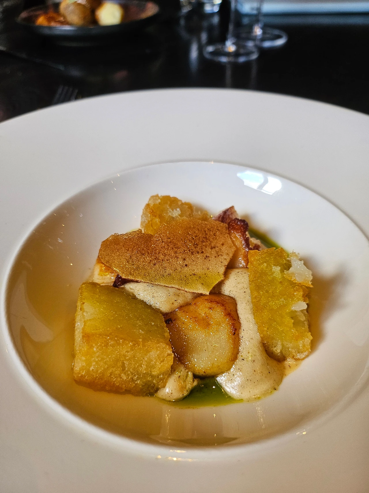 와인도 맛있었고 메인에서 디저트까지 모든 음식의 식감이 아름다웠다. 편안한 인테리어에 훌륭한 조명과 조용하고 세심한 서비스는 덤이다. 가격도 착하다. 우리는 시간이 없어 테이스팅 메뉴를 주문하지 못했지만, 기대되는 메뉴들이 엿보였다. 다음에 기회가 있다면 도전해 보고 싶다. 말로 설명할 수 없는 맛과 서비스. 모두가 아는 그 맛을 어떻게 이런 조합으로 정리할 수 있을까? 모든 재료의 맛이 순수하게 느껴졌다. 요알못이지만 세심한 재료손질에 조리방법이 궁금해지는 맛이었다. 디저트도 맛있었다. 영국 초코파이 wagon wheel의 최최최 상위 버전 디저트 느낌?