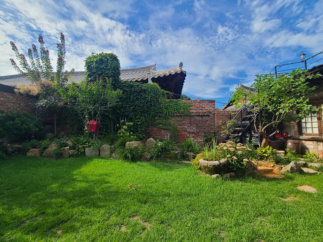 오랜만에 온 전주 한옥마을은 여전히 활기찬 곳이었습니다. 그 가운데 저희가 정한 숙소는 작은 한옥집이었어요. 대문을 열면 작은 고요와 햇살이 내려앉은 마당과 유년 시절을 떠올리게 하는 마루가 있는. 아이는 '마루다!' 하며 신나서 신발도 벗지 않고 마루에 올랐어요. 저는 아이에게 신발을 벗으라고 일러주고 같이 마루에 앉았습니다. 볕이 뜨겁기는 했지만 기분은 선선했어요.