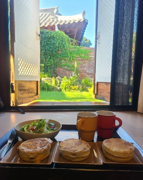 이튿날, 저희는 떠날 준비로 분주히 움직였습니다. 아주머니는 원래 직접 가져다 먹어야 하는 조식을 직접 방으로 가져다주셨어요. 세 식구만을 위한 특별한 잉글리시 머핀과 샐러드였어요. 이렇게까지 신경 써주시다니. 너무 감사하고 놀라서, 진심을 담아 어제 전해 드리지 못한 감사함까지 한 번에 쏟아냈죠.
