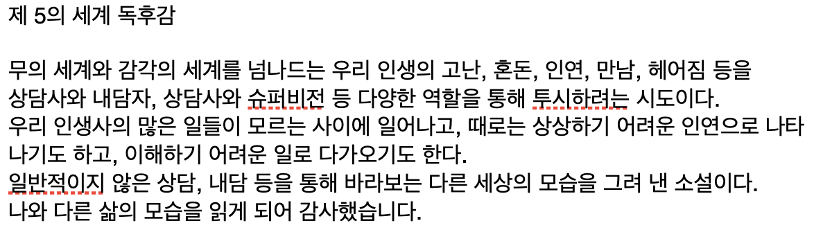 처음 쓴 습작이지만, 나에게는 아주 빛나는 한 작품이다. 내가 소설도 쓸 수 있구나! 하는 가능성을 보기도 한 책이다. 주변에 몇몇 분들이 직접 읽어주셨고, 좋은 피드백도 많이 받았다. 물론 아쉬운 점도 함께 말이다.