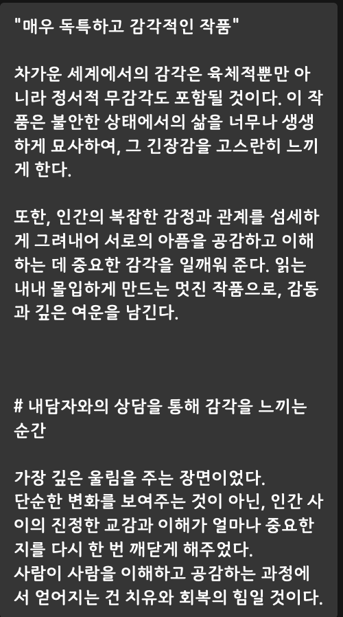 사실, 처음 아주 좋은 소설을 보고, 쓰기 시작했다. 이 소설을.. 피드백을 얻기 위해 다양한 사람들에게 이 소설을 보내드리고, 서평과 피드백을 요청드렸다. 그렇게 읽어주신 분들에 피드백을 녹이니, 더 완성도가 높은 소설이 되었다. 정말 이 소설을 쓰는 동안 난 빠져서 산다! 쓴다! 라는 말을 느낄 수 있었다. 나는 완전 소설에 매료되어, 주인공처럼 살았다! 그러니, 실감나게 묘사하고, 더 그 감정을 느끼며 집필 할 수 있었다.