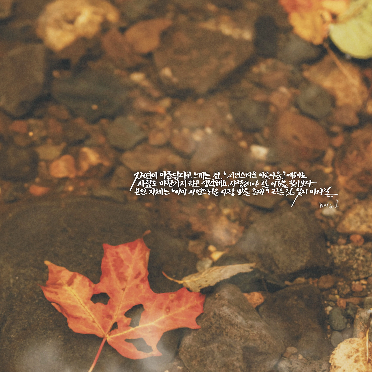 그러니, 한 없이 내가 작고 초라할 때 기억하자! 그리고 자연으로 눈을 돌려보자, 자연은 존재 자체로 아름답다고 말한다. 자연은 훼손되어도 아름답다고 한다. 그 자연 속에 낙엽 혹은 나무 그것들은 자연스러운 아름다움으로 남는다.