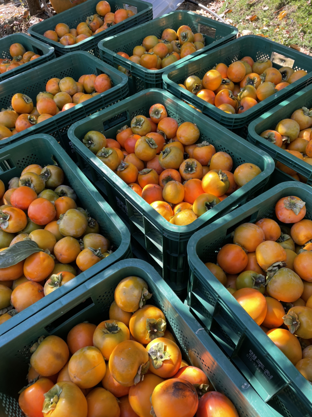 그런데 올 해에는 감이 참으로 많이 열렸다. 여기저기 감이 풍년이라는 이야기가 많았다. 주렁주렁 탐스럽게 달린 감을 따는 날, 나도 한몫 거들기로 했다. 사실 나는 감을 땄다고 하기보다는 떨어진 감을 주우러 다녔다고 하는 게 맞을 것이다. 손이 닿는 것은 나도 땄지만, 손이 닿지 않는 높이의 감들이 대다수였다. 엄마가 장대로 높이 달린 감을 따서 바닥에 내려놓으면 나는 바구니를 들고 다니며 열심히 줍는 것이다. 들고 다니는 바구니에 감이 쌓이면 콘티 박스(농산물 운반상자)에 부었다.