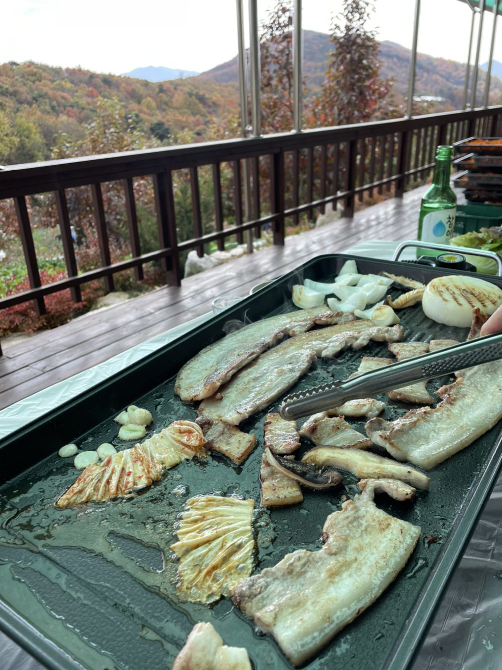 오전 동안 딴 감을 한데 모아 놓는 작업까지 마치자, 드디어 기다리고 기다리던 점심시간이었다. 우리는 함께 슈퍼에 가서 삼겹살을 사 가지고 왔다. 테라스의 테이블에 몇 가지 반찬과, 고기 불판, 수저, 그리고 소주잔까지 올렸다. 그리고 마침내 치이익- 삼겹살 굽는 소리. 딱 열 달 만에 먹는 삼겹살이었다. 바람은 조금 불었지만 완연한 가을 날씨에 끝내주는 울긋불긋한 배경까지 갖추고 있으니, 삼겹살의 맛은 완벽할 수밖에 없었다.