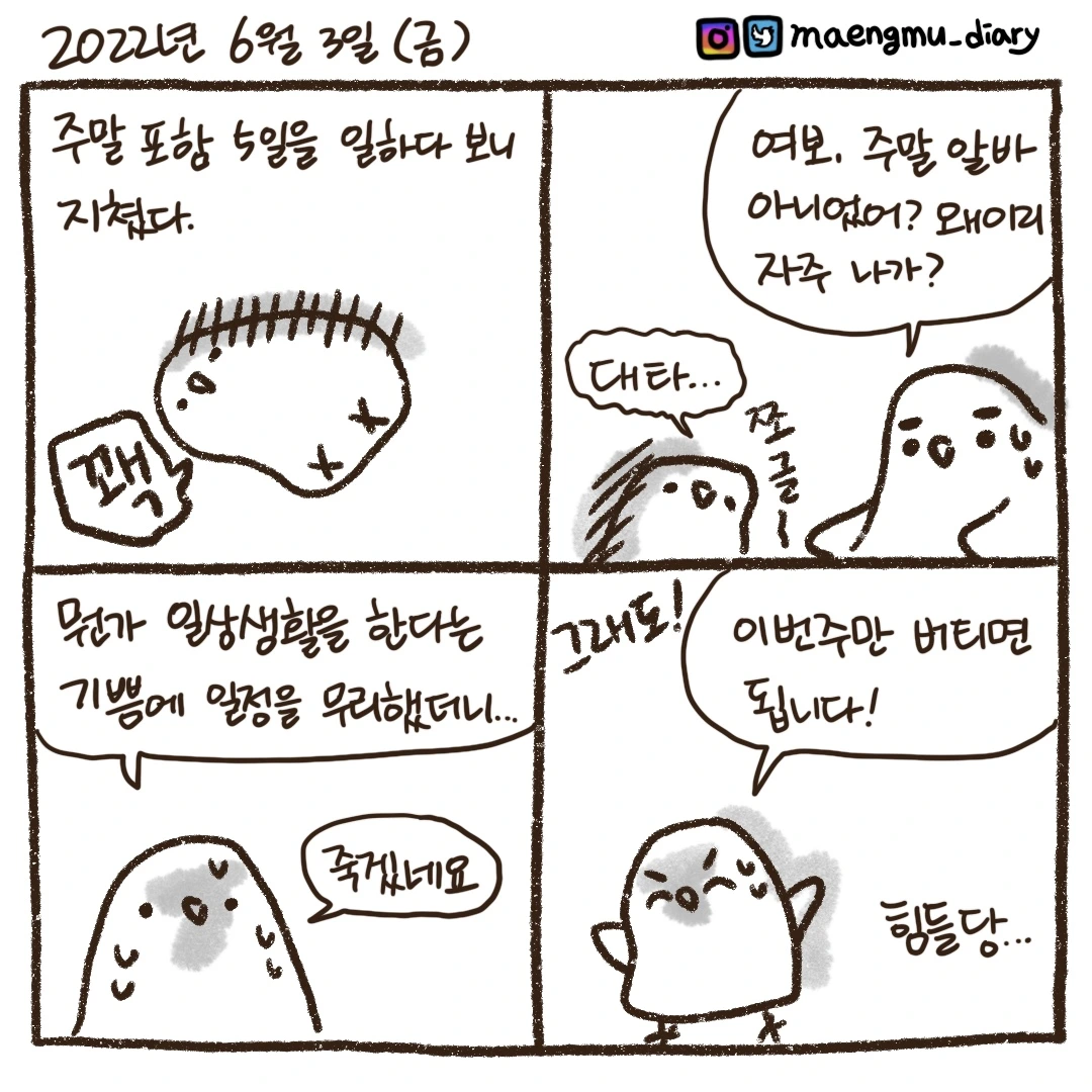 일상생활을 한 지 얼마 되지도 않은 상태에서 무리하게 일을 해서 그런가 벌써부터 지치는 느낌이에요.