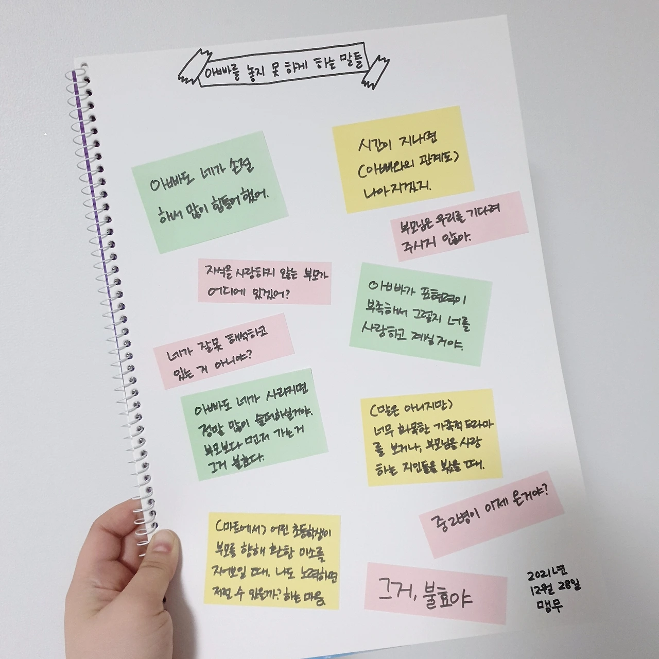 포스트잇으로 적어보니, 가족적인 드라마나 화기애애한 가족애만 봐도 나에게는 은연중의 상처였다는 걸 알게 됐다.