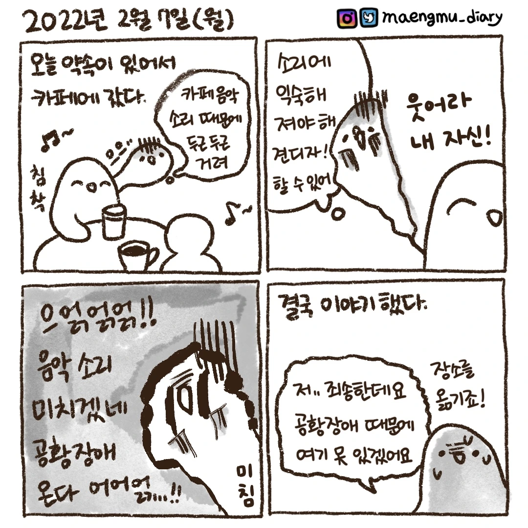나는 괜찮다, 괜찮다. 속으로 몇 번을 생각했지만 잔잔한 음악소리도 제게는 공격 대상인 것 같습니다.