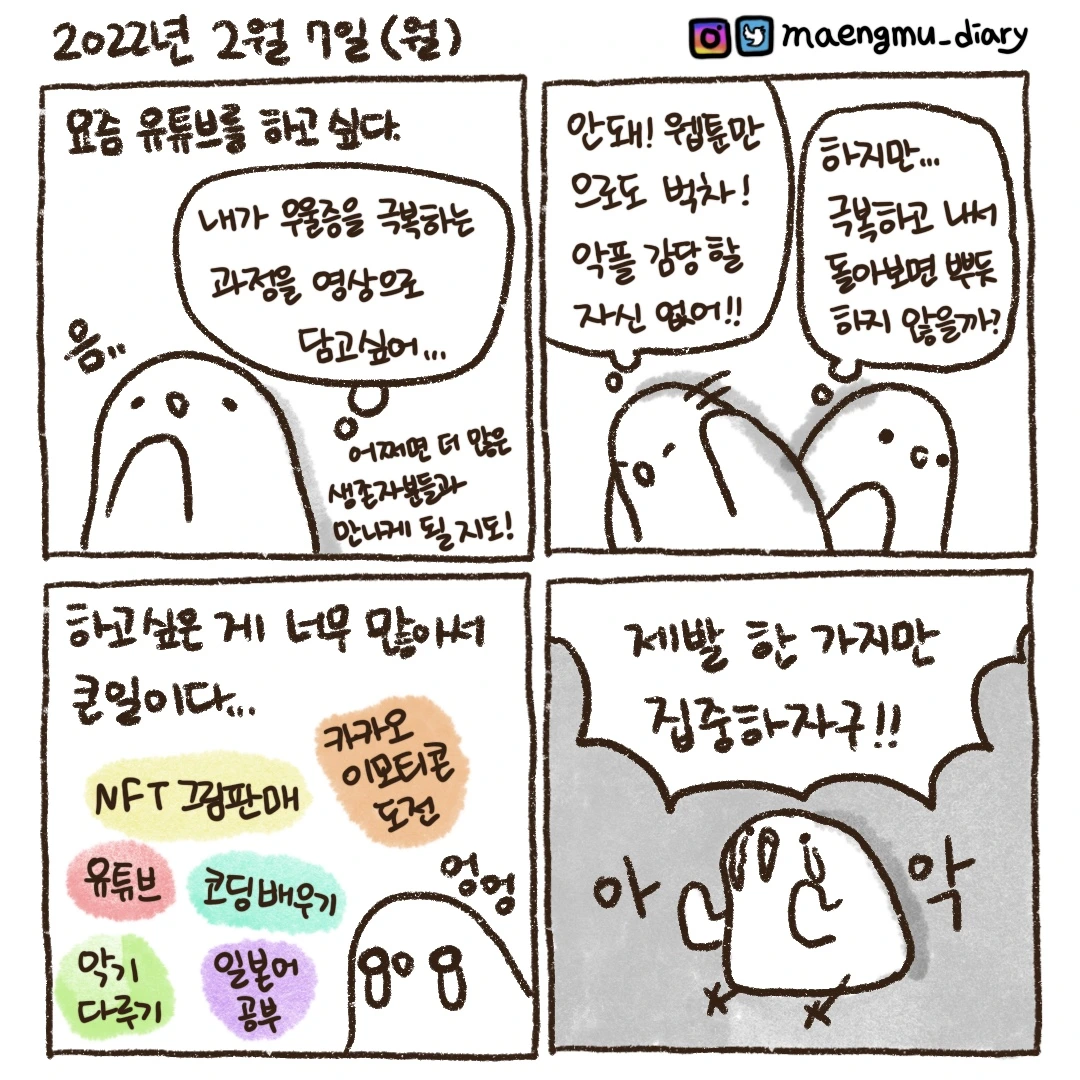 유튜브도 하고 싶고, 카카오 이모티콘 도전, nft그림 판매하기, 악기 다루기, 일본어 공부하기 등 하고 싶은 건 많은데 몸이 안 따라줘서 서럽습니다.