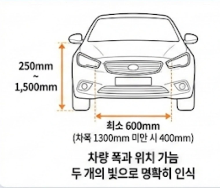 주간 주행등이 너무 밝거나 위치가 어긋나면 오히려 다른 운전자에게 방해가 될 수 있습니다. 법규는 이를 방지하기 위해 매우 정밀한 설치 기준을 제시합니다.