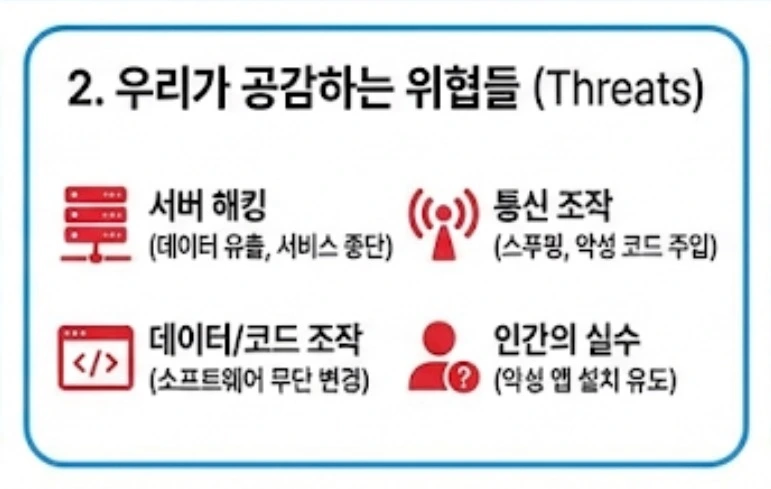 우리가 막연히 걱정했던 부분들이 실제로 규정 내 위협 리스트에 구체적으로 명시되어 있습니다. 제조사는 다음과 같은 위험들을 반드시 관리해야 합니다.