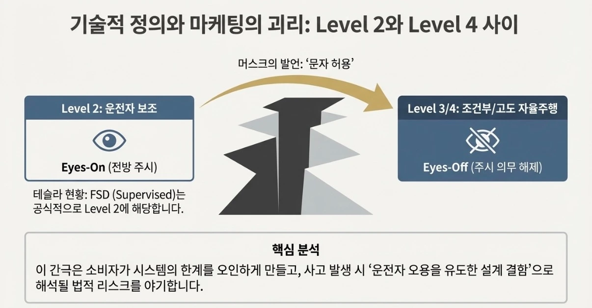 기술적 진실 (Level 2의 한계): 현재 테슬라의 FSD(Supervised)는 기술적으로 레벨 2입니다. 시스템이 조향과 가속을 돕지만, 운전자는 언제든 개입할 준비를 하고 전방을 주시해야 할 의무가 있습니다. 머스크의 발언은 사실상 레벨 3(시스템 책임 구간) 이상의 경험을 약속하는 것이지만, 법적/기술적 토대는 아직 거기에 미치지 못했습니다.