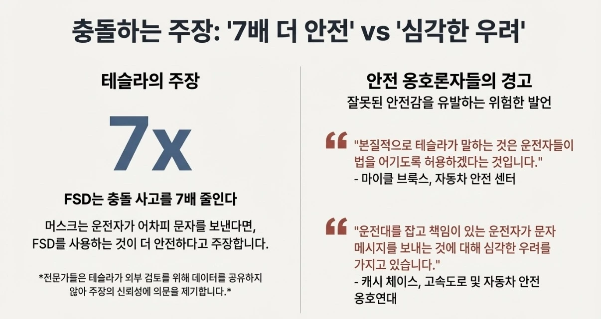 이런 운전자들의 불안과 달리, 일론 머스크는 최근 투자자들에게 "본질적으로 운전 중 문자를 보내는 것을 허용할 것"이라며 자신감을 내비쳤습니다. FSD 사용 시 사고율이 훨씬 낮다는 자체 데이터를 근거로 말이죠.