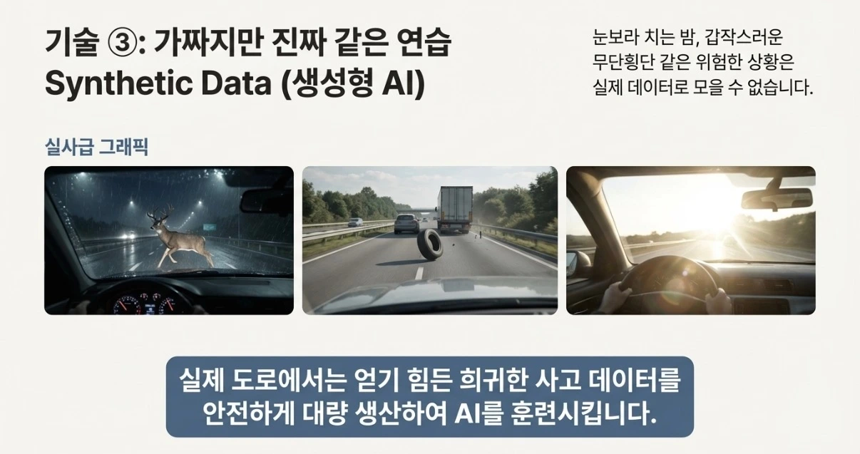 * 개념: 눈보라가 치는 밤이나 갑작스러운 무단횡단 같은 위험한 상황을 실제로 겪으며 데이터를 모을 순 없습니다. 대신 생성형 AI가 이런 상황을 '실사급 그래픽'으로 만들어냅니다.