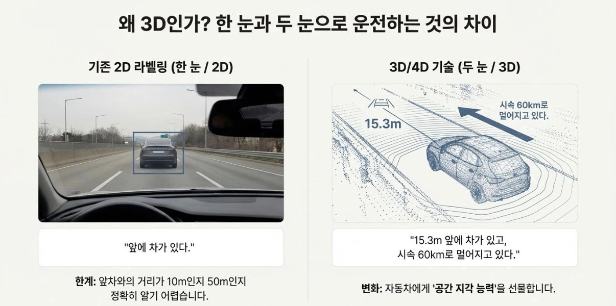 반면 3D/4D 기술은 자동차에게 '공간 지각 능력'을 선물합니다.