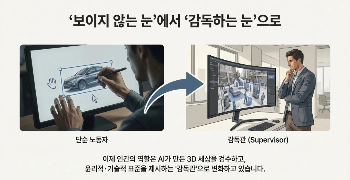 이제 인간의 역할은 화면에 네모 칸을 그리는 '단순 노동자'에서, AI가 만든 3D 세상을 검수하고 윤리적·기술적 표준을 제시하는 '감독관(Supervisor)'으로 변화해야 합니다.