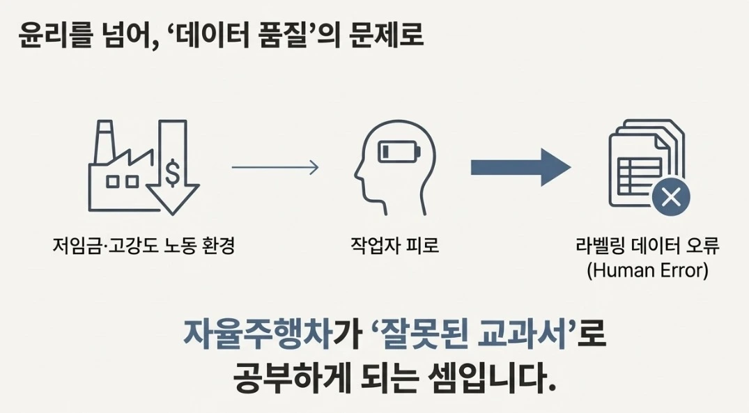 이것은 단순한 윤리적 문제를 넘어 '데이터 품질'의 문제와 직결됩니다. 저임금·고강도 노동 환경은 작업자의 피로를 유발하고, 이는 곧 라벨링 데이터의 오류(Human Error)로 이어집니다. 자율주행차가 잘못된 교과서로 공부하게 되는 셈입니다.