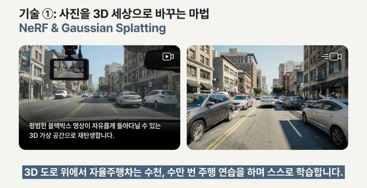 * 효과: 마치 영화 <매트릭스>처럼 가상으로 만들어진 3D 도로 위에서, 자율주행차는 수천 번, 수만 번 주행 연습을 하며 스스로 학습할 수 있게 됩니다.