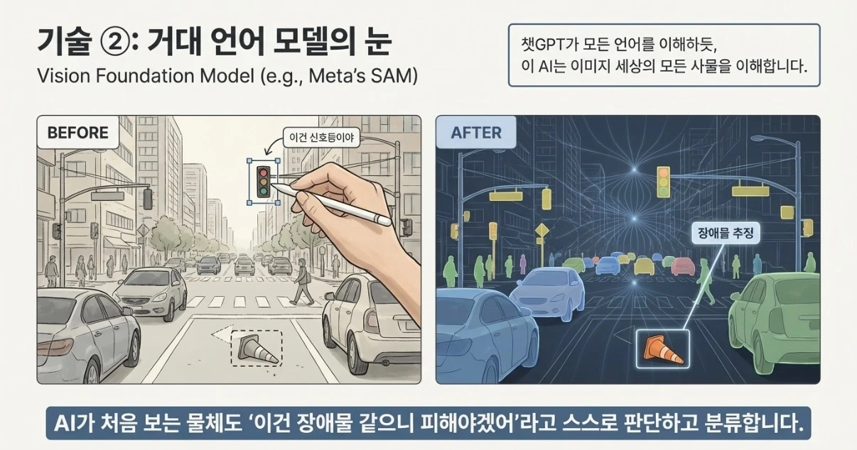 * 효과: 예전에는 "이건 신호등이야"라고 하나하나 알려줘야 했지만, 이제는 AI가 처음 보는 물체도 "이건 장애물 같으니 피해야겠어"라고 스스로 판단하고 분류(Labeling)합니다.
