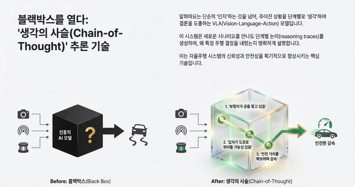 하지만 알파마요(Alpamayo)는 다릅니다. 이 모델의 핵심은 '추론(Reasoning)'입니다. 챗GPT가 우리가 질문하면 논리적으로 대답하듯, 자동차가 도로 상황을 보고 생각의 사슬(Chain-of-Thought)을 만들어냅니다.