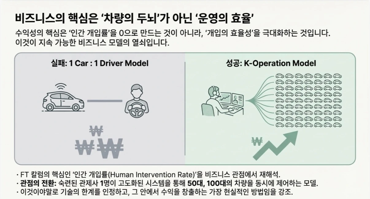 로드니 브룩스의 지적대로, 차량 대 인간 비율(Vehicle-to-Human ratio)을 획기적으로 높이지 못하면 사업성은 요원합니다. 한 명의 관제사가 10대, 100대의 차량을 동시에 관리할 수 있는 시스템을 갖추는 것, 그것이 자율주행이 단순한 기술 실험을 넘어 돈이 되는 사업이 되는 유일한 길입니다.