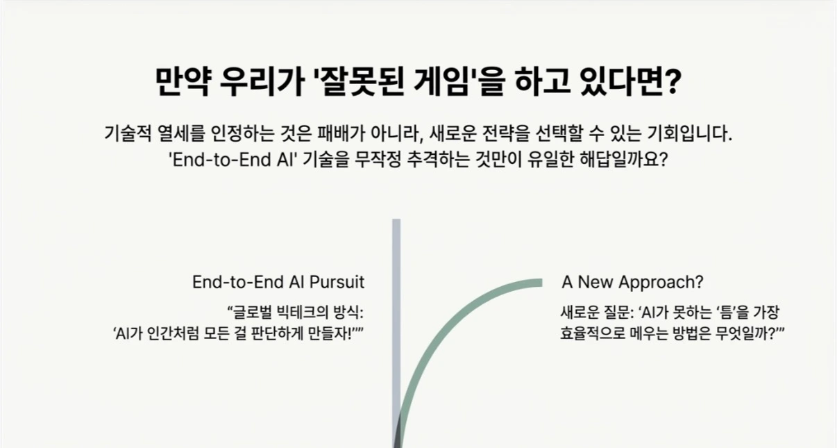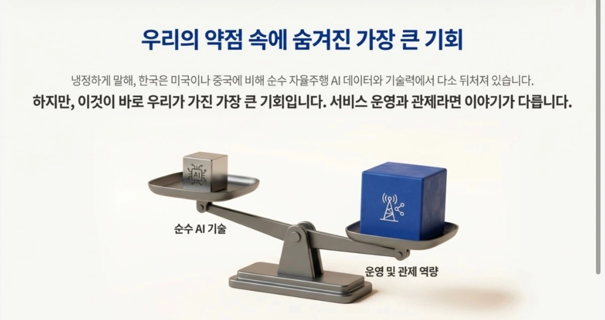 냉정하게 말해, 한국은 미국이나 중국에 비해 순수 자율주행 AI 데이터와 기술력에서 다소 뒤처져 있습니다. 하지만 서비스 운영과 관제라면 이야기가 다릅니다. 우리는 AI의 부족한 성능을 세계 최고의 통신 기술과 세심한 운영 역량으로 메워 충분히 경쟁력 있는 모델을 만들 수 있습니다.