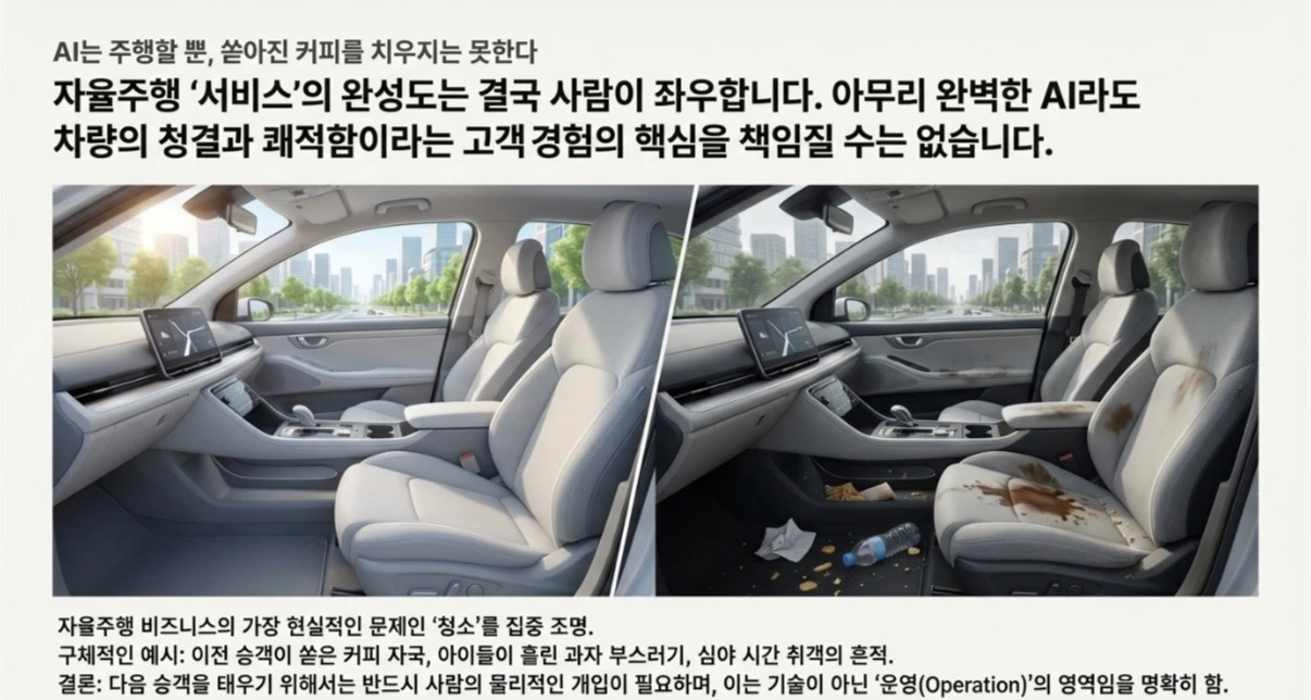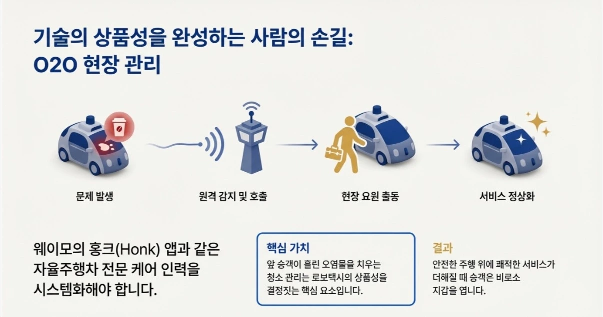 * 현실적인 현장 관리(O2O) 시스템화: 웨이모의 홍크(Honk) 앱처럼, 문 닫기나 청소, 급유/충전 등을 해결하는 자율주행차 전문 케어 인력을 시스템화해야 합니다. 안전한 주행 위에 쾌적한 서비스가 더해질 때 승객은 비로소 지갑을 엽니다. 특히 앞 승객이 흘린 오염물을 치우는 청소 관리는 로보택시의 상품성을 결정짓는 핵심 요소입니다.