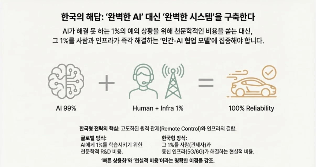 비즈니스의 경제성도 중요하지만, 그 모든 논의의 전제는 완벽한 안전입니다. 한국은 AI의 기술적 한계를 인프라로 보완하여 안전과 효율을 동시에 잡을 수 있는 최적의 환경을 갖추고 있습니다.