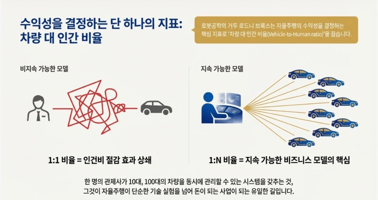로봇공학의 거두 로드니 브룩스는 자율주행의 수익성을 결정하는 핵심 지표로 인간 개입률(Human Intervention Rate)을 꼽습니다. 차량 1대당 인간 1명이 필요하다면 로보택시의 경제적 이점인 인건비 절감 효과는 완전히 사라집니다. 자율주행차가 운전기사를 대체해 비용을 줄이겠다는 본래의 목적이 무색해지기 때문입니다.