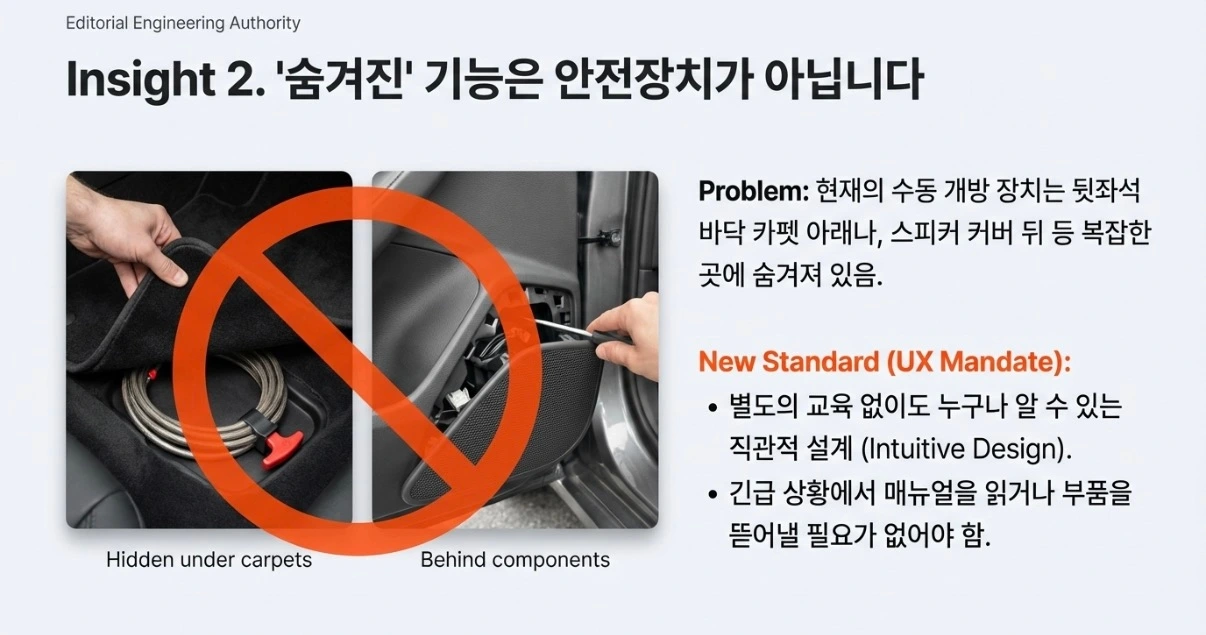 둘째, 직관적 설계의 의무화입니다. 사실 지금도 수동 개방 장치는 차 안에 존재합니다. 하지만 뒷좌석 바닥 카펫 아래 숨겨져 있거나 복잡한 커버를 뜯어내야 한다면 긴급 상황에서는 무용지물입니다. 앞으로는 별도의 교육 없이도 누구나 즉각 알 수 있는 수준의 UX 설계가 강제될 것입니다.