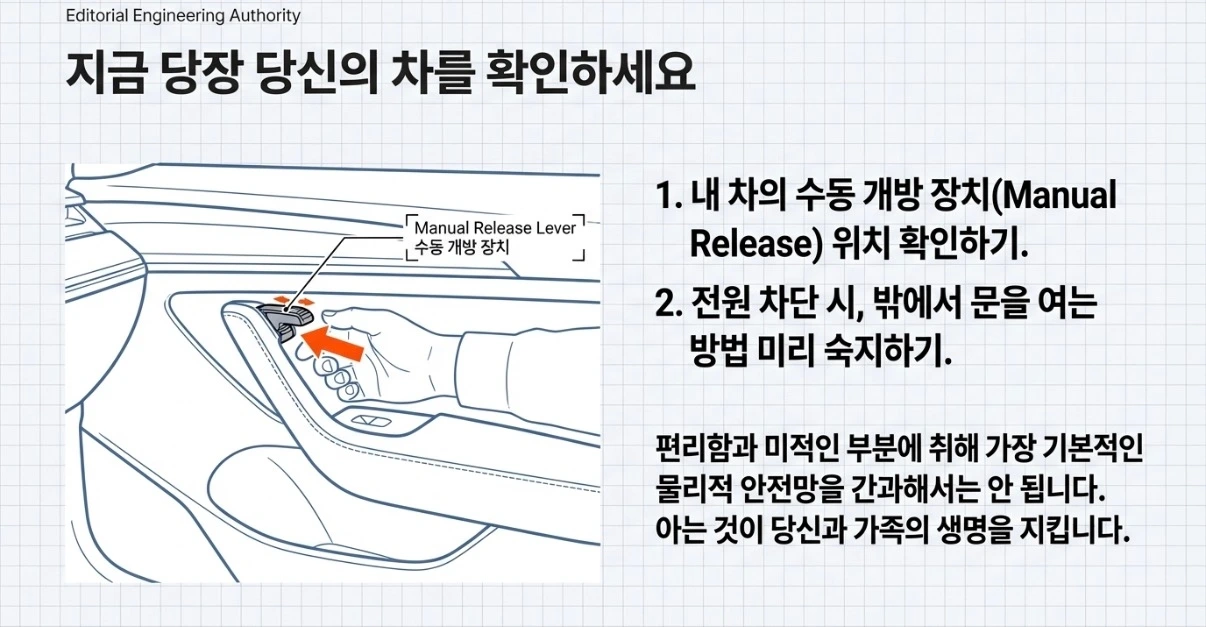 오늘 여러분의 차량 매뉴얼을 한 번 확인해 보세요. 내 차의 수동 개방 장치는 어디에 있고, 밖에서는 어떻게 열 수 있는지 미리 알아두는 것만으로도 소중한 생명을 지킬 수 있습니다.