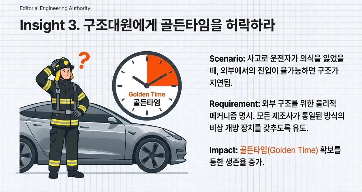 셋째, 구조대원을 위한 접근성 확보입니다. 사고로 운전자가 의식을 잃었을 때 외부에서 구조대원이 문을 열지 못해 골든타임을 놓치는 경우가 많습니다. 이번 법안은 외부 구조를 위한 물리적 메커니즘을 명시함으로써, 모든 제조사가 통일된 방식의 비상 개방 장치를 갖추도록 유도할 것입니다.