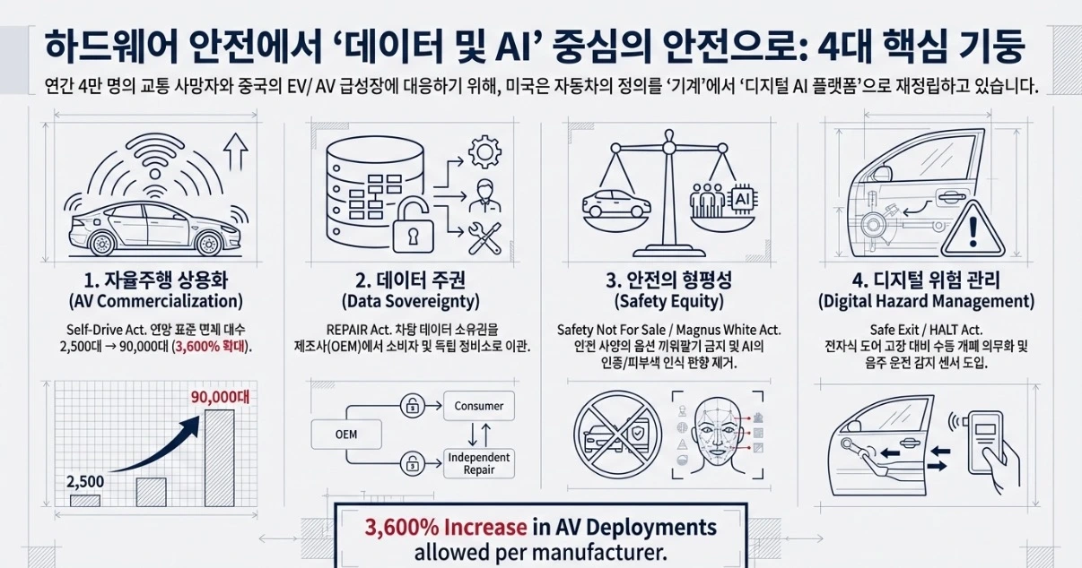 주 정부마다 제각각인 파편화된 규제를 연방 표준으로 통합하고 제조사가 차량의 안전성을 스스로 데이터로 입증하는 안전 사례(Safety Case) 방식을 도입하여 기술 혁신과 안전 사이의 균형을 잡으려 하고 있습니다.