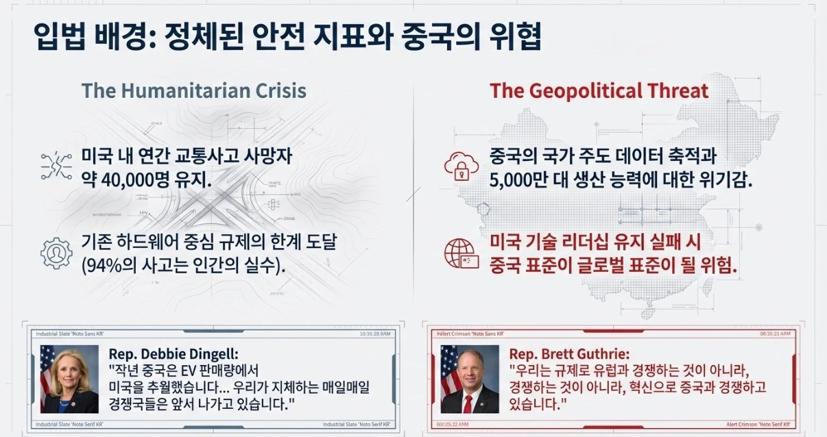 특히 중국이 국가 주도로 대규모 주행 데이터를 축적하며 앞서나가는 상황에서 미국 기업들이 규제에 묶이지 않고 대량 생산과 데이터 확보에 나설 수 있도록 판을 깔아준 조치입니다.
